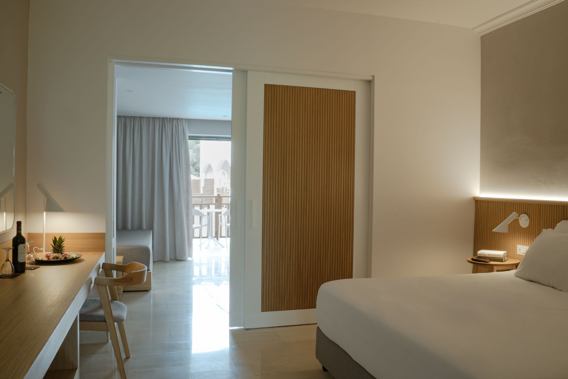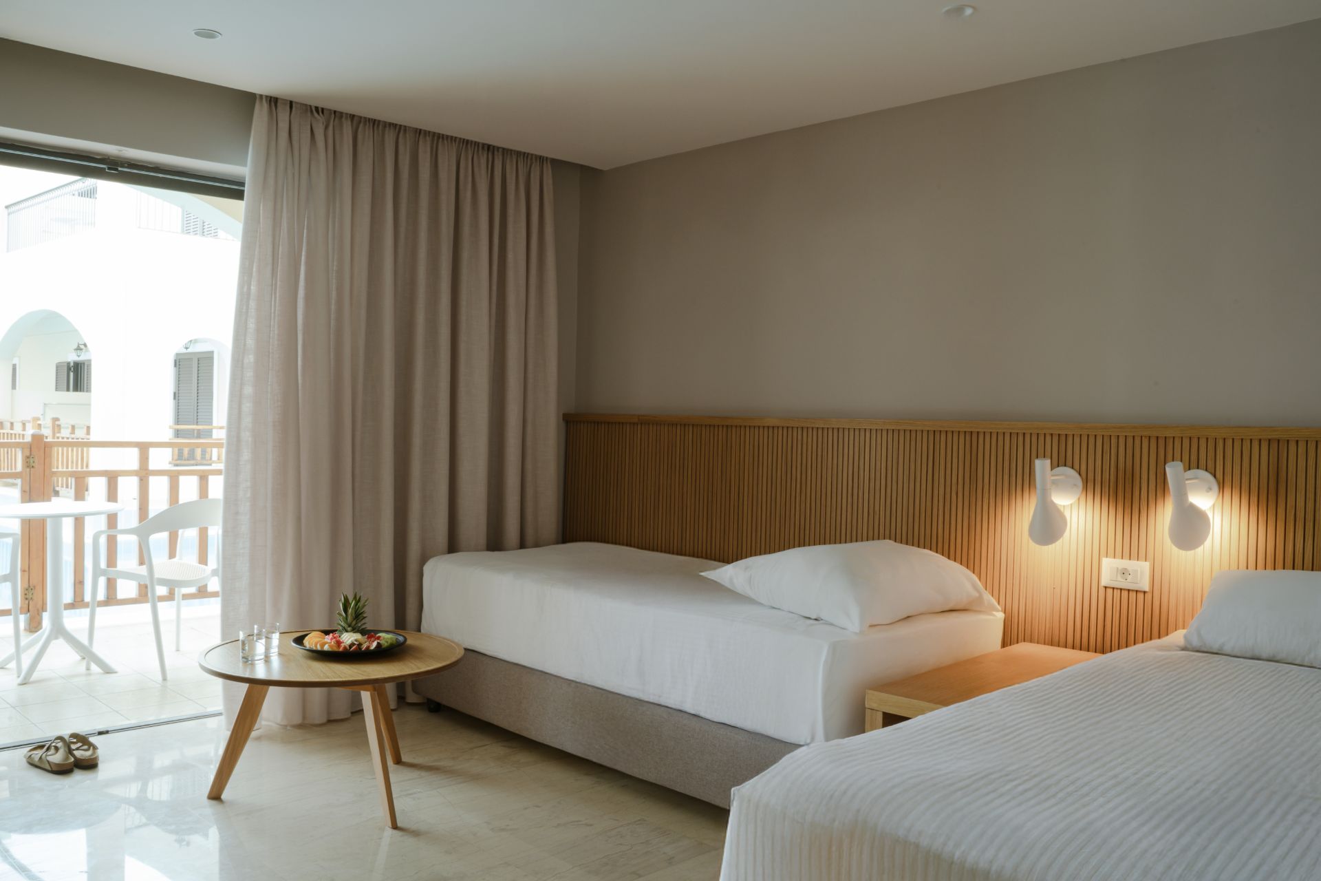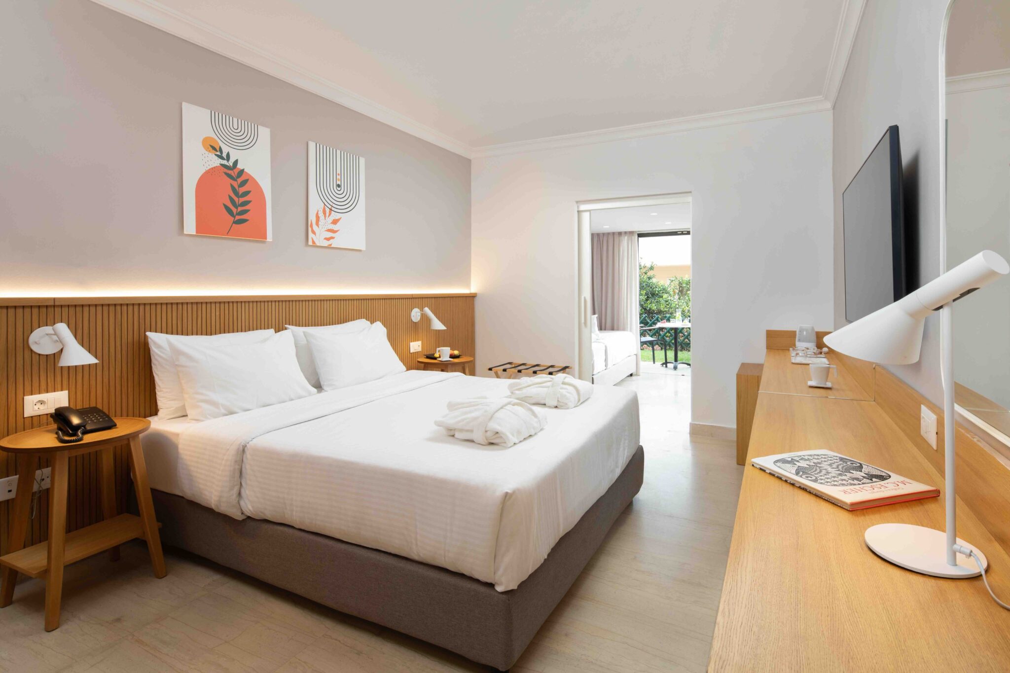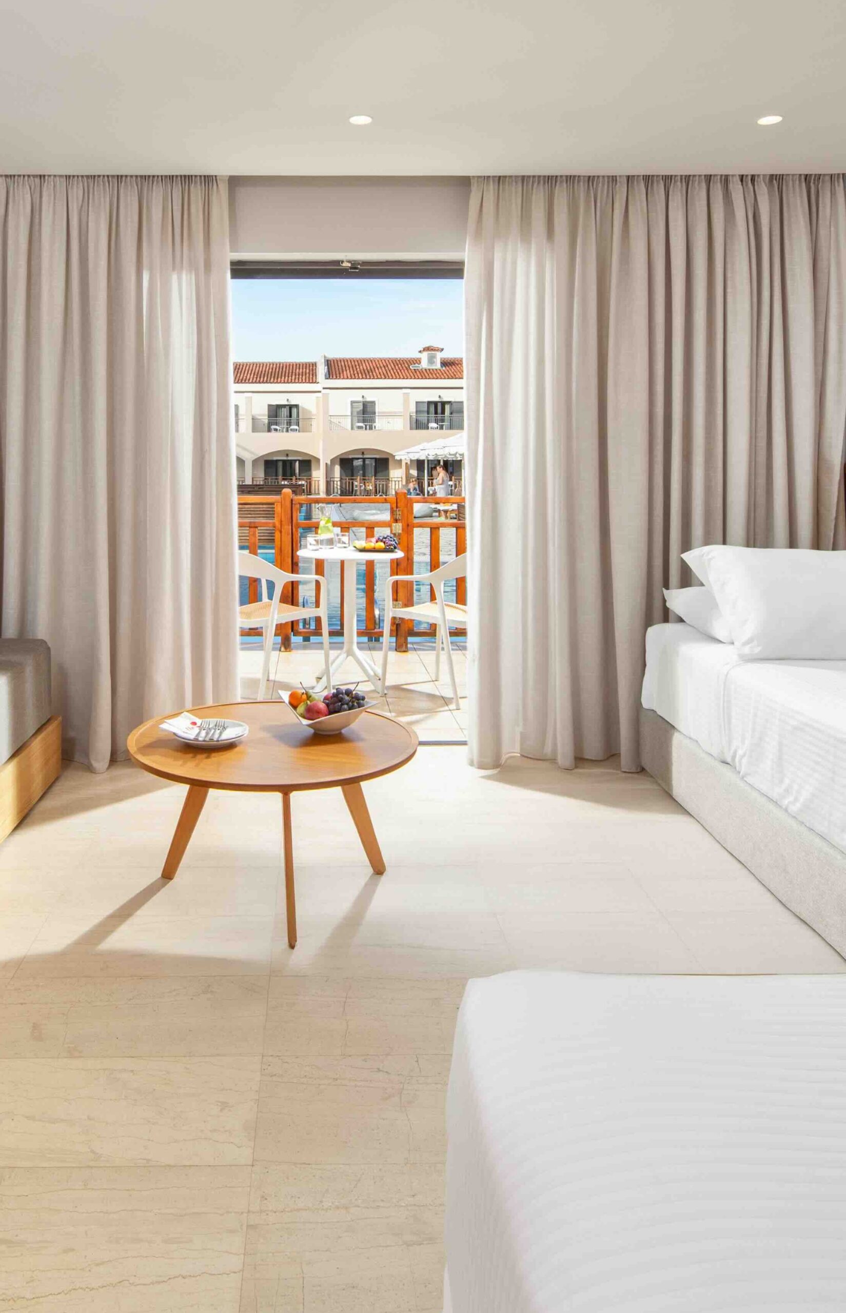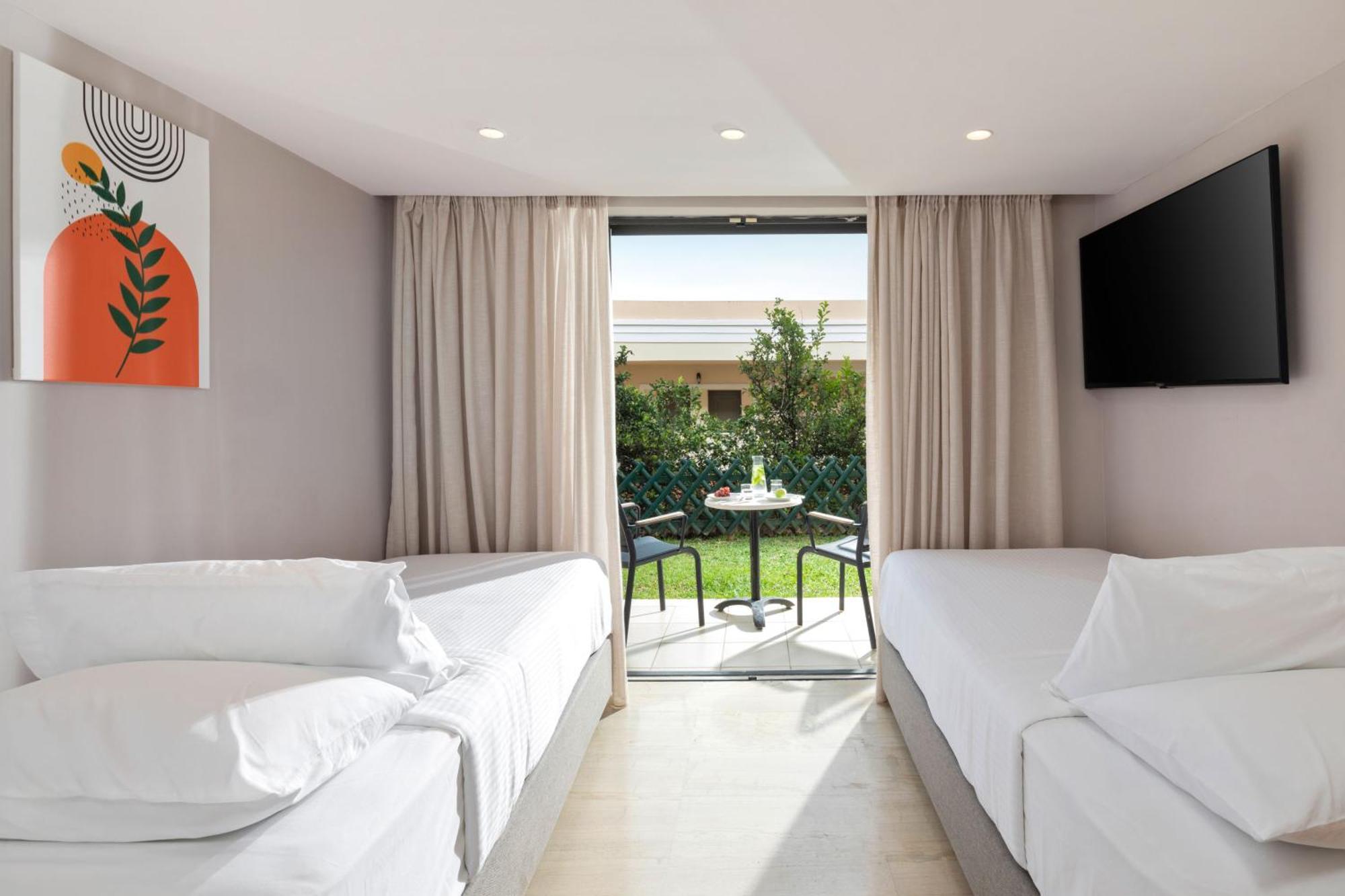 kompletne zrekonštruované rodinné izby (zima 2024/25) v rezorte Roda Beach Resort, ktoré sa vyznačujú svetlým, moderným a otvoreným dizajnom, ideálnym pre pohodovú dovolenku celej rodiny. Priestranná dispozícia zahŕňa spojený obývací a spálňový priestor s manželskou posteľou, samostatnú izbu s dvomi pohodlnými rozkladacími pohovkami, kúpeľňu so sprchovacím kútom a súkromnú terasu alebo balkón s komfortným posedením. Izby sa nachádzajú v hlavnej budove alebo v priľahlej dependance.