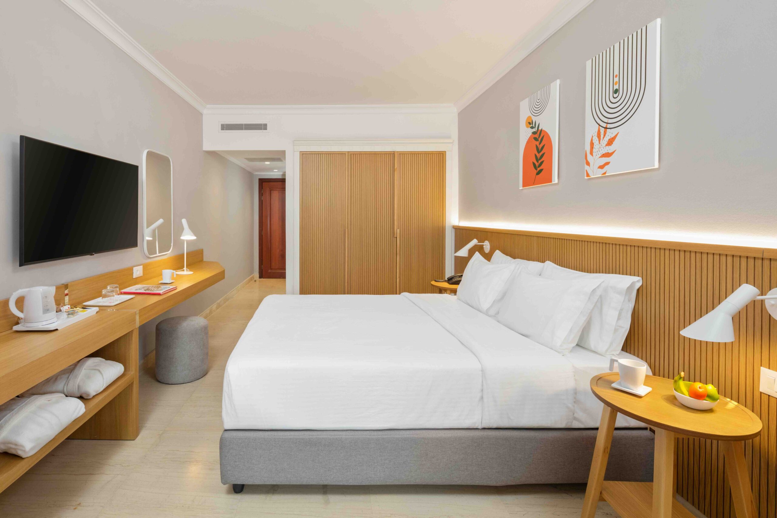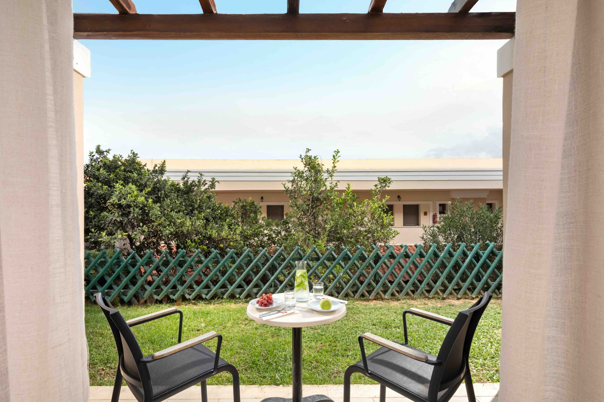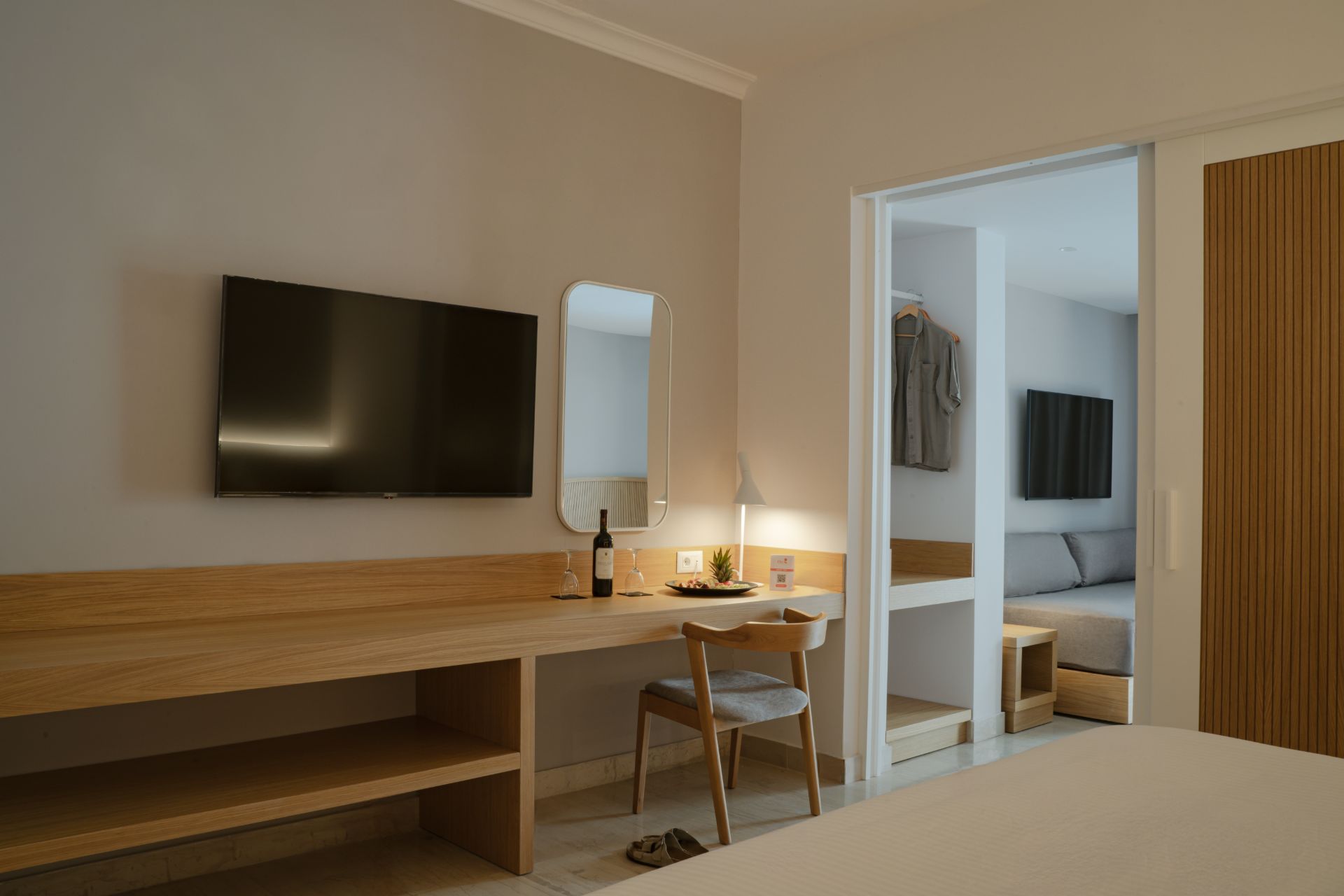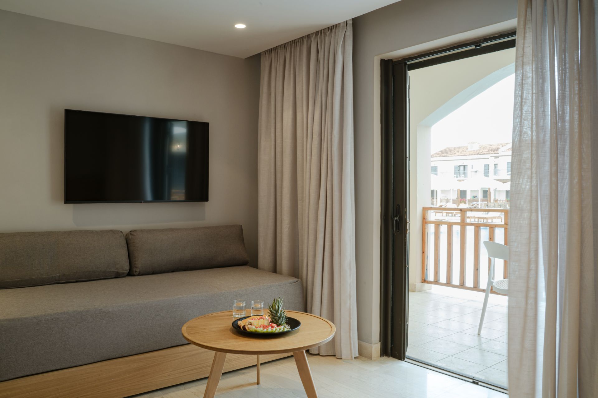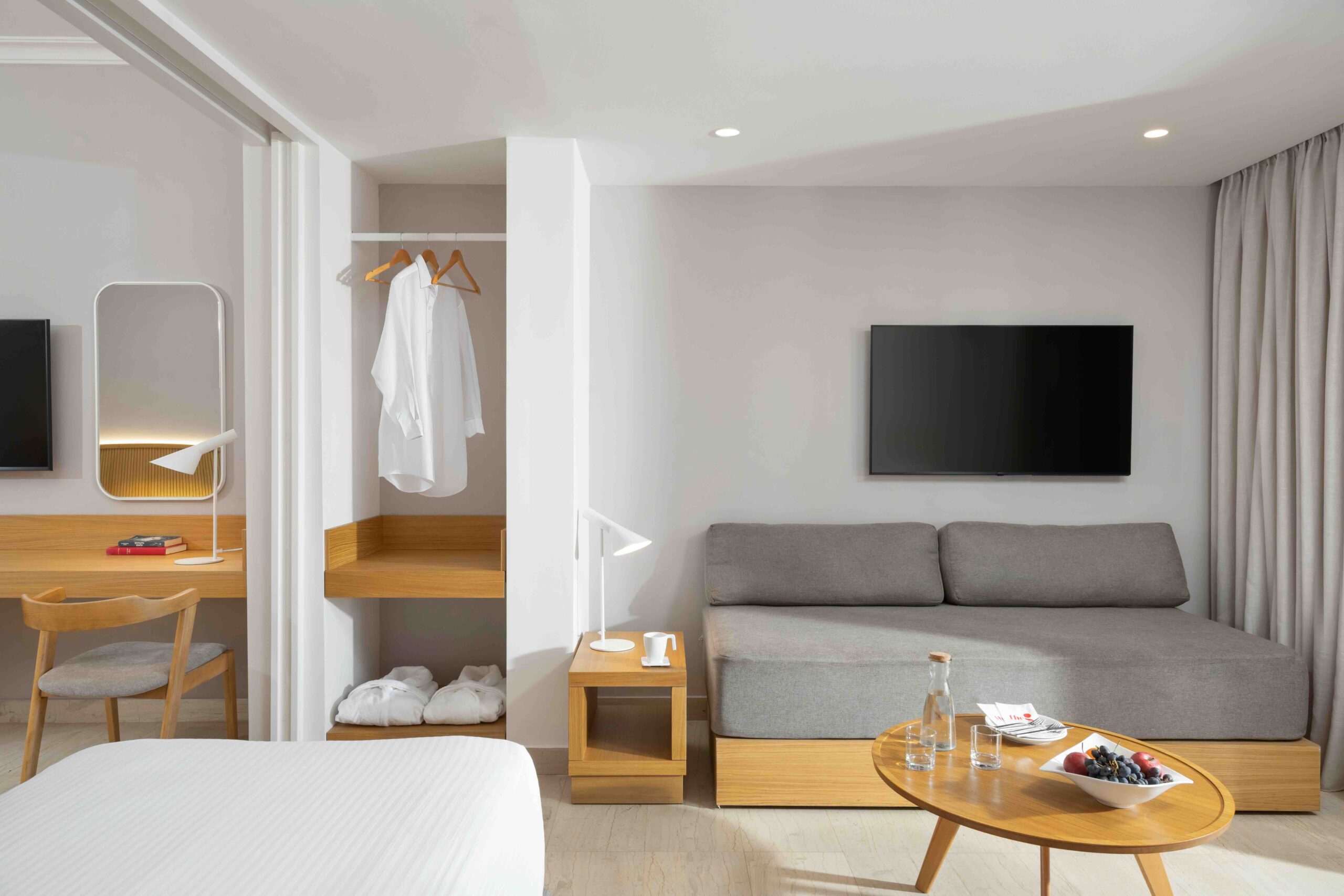 kompletne zrekonštruované rodinné izby (zima 2024/25) v rezorte Roda Beach Resort, ktoré sa vyznačujú svetlým, moderným a otvoreným dizajnom, ideálnym pre pohodovú dovolenku celej rodiny. Priestranná dispozícia zahŕňa spojený obývací a spálňový priestor s manželskou posteľou, samostatnú izbu s dvomi pohodlnými rozkladacími pohovkami, kúpeľňu so sprchovacím kútom a súkromnú terasu alebo balkón s komfortným posedením. Izby sa nachádzajú v hlavnej budove alebo v priľahlej dependance.