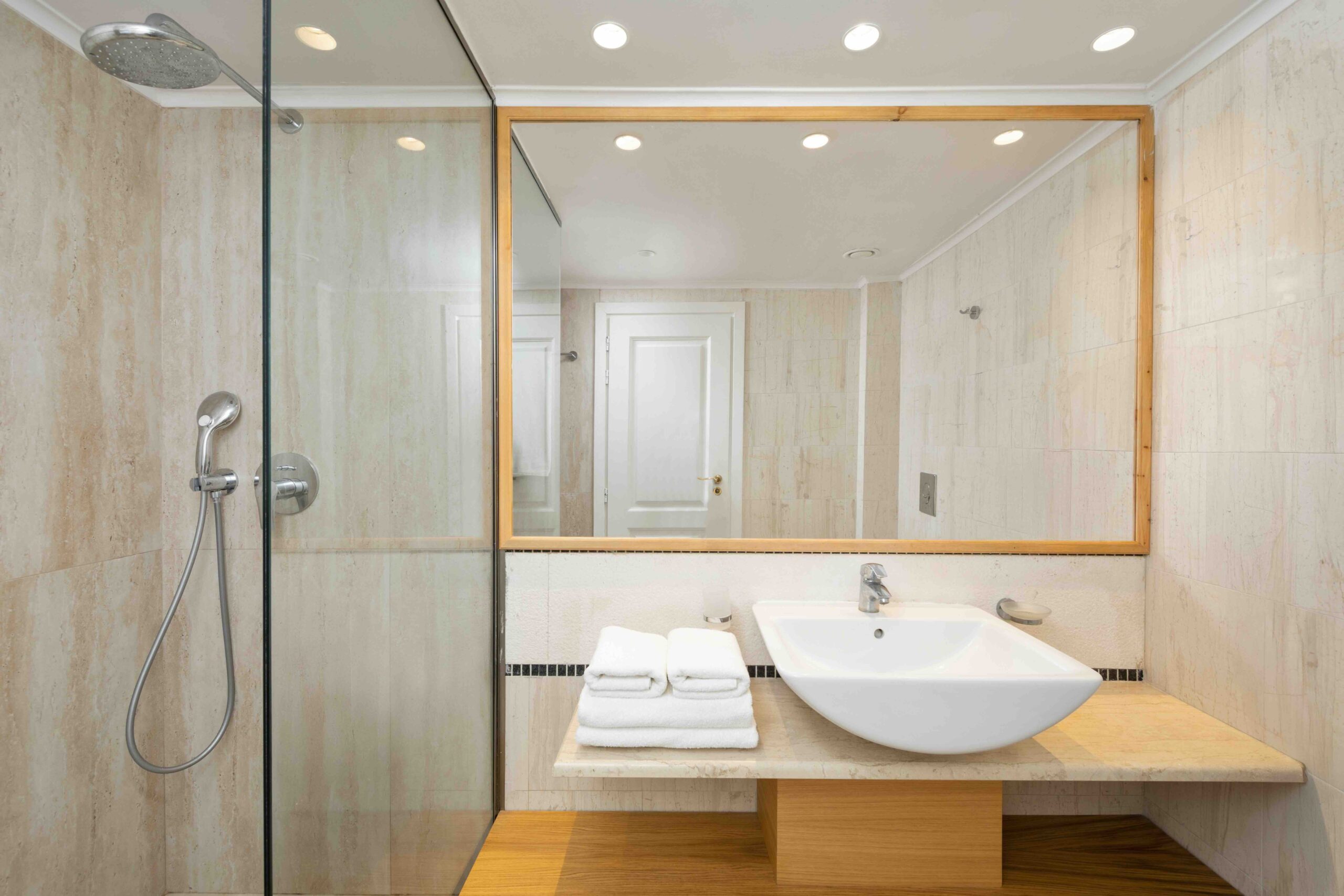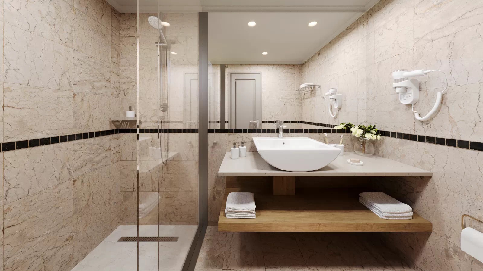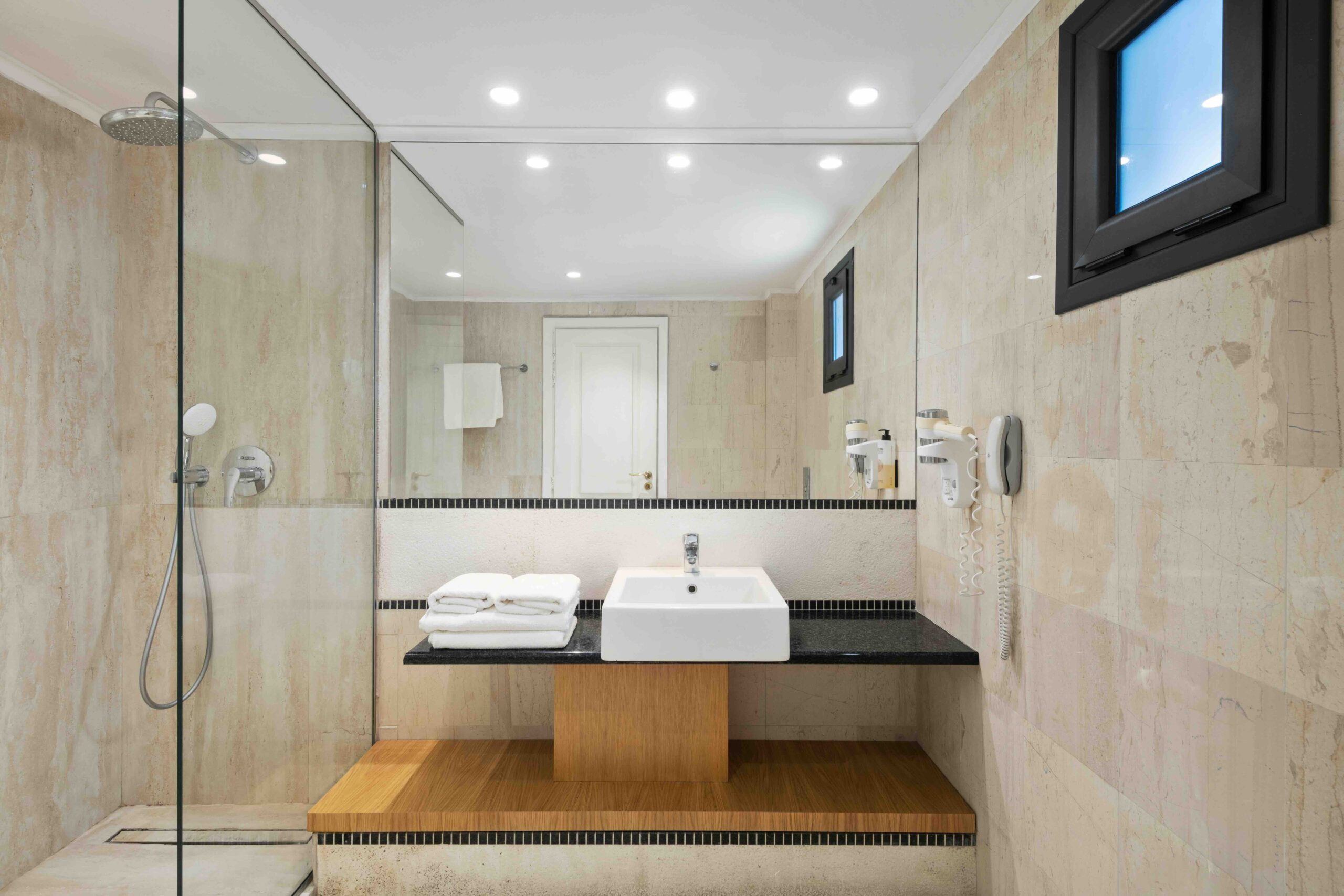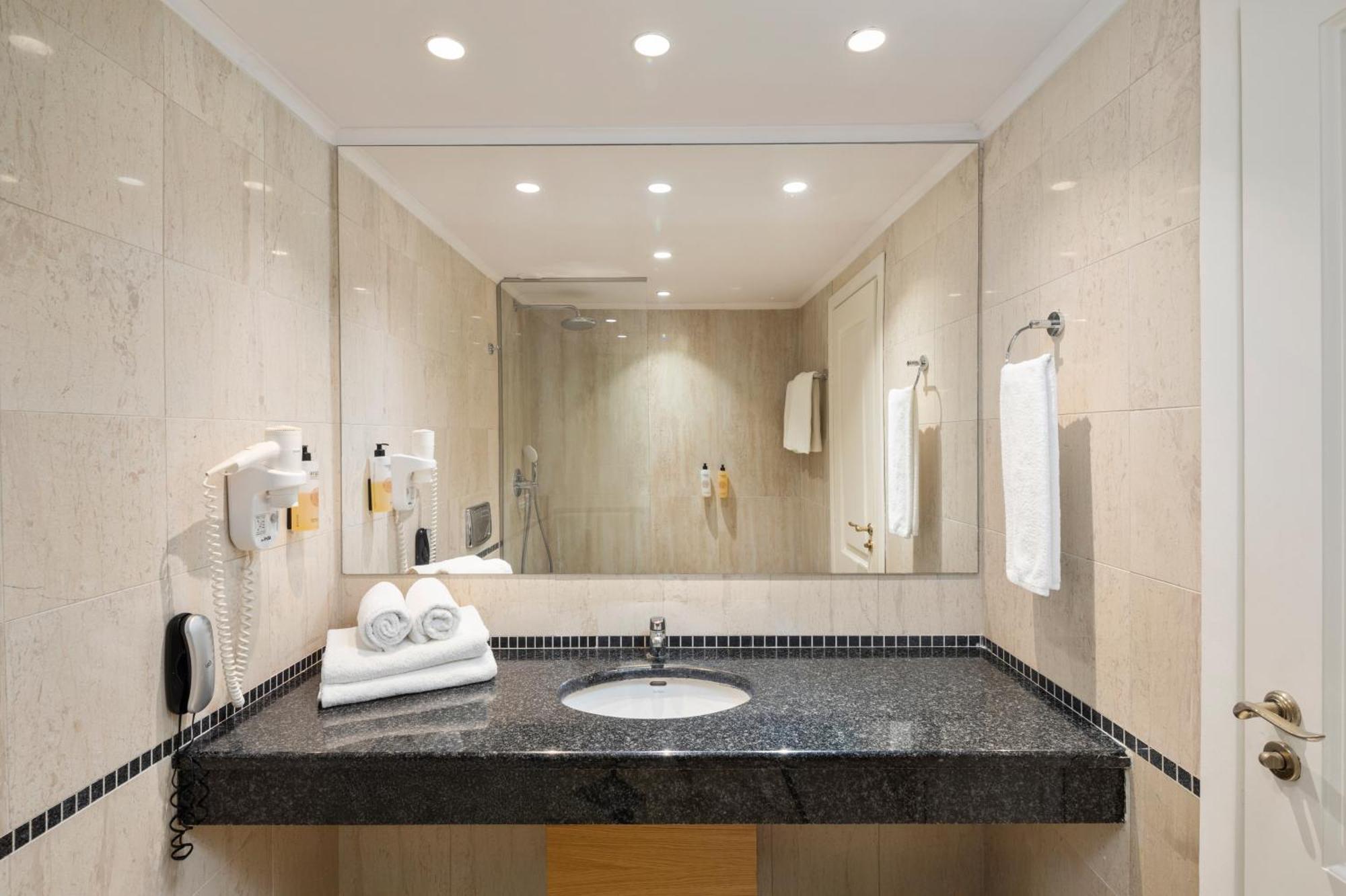 kúpeľňa s WC (sušič vlasov, papuče a župany), SAT TV, klimatizácia, súprava na prípravu kávy a čaju, telefón, minichladnička s denným dopĺňaním vody, trezor, balkón alebo terasa.